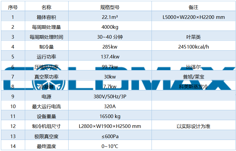 八卡板果蔬真空預冷機主要針對中型農場的預冷加工使用;真空箱容積24.4m3,庫容量4000kg,預冷溫度設計為0~10℃;